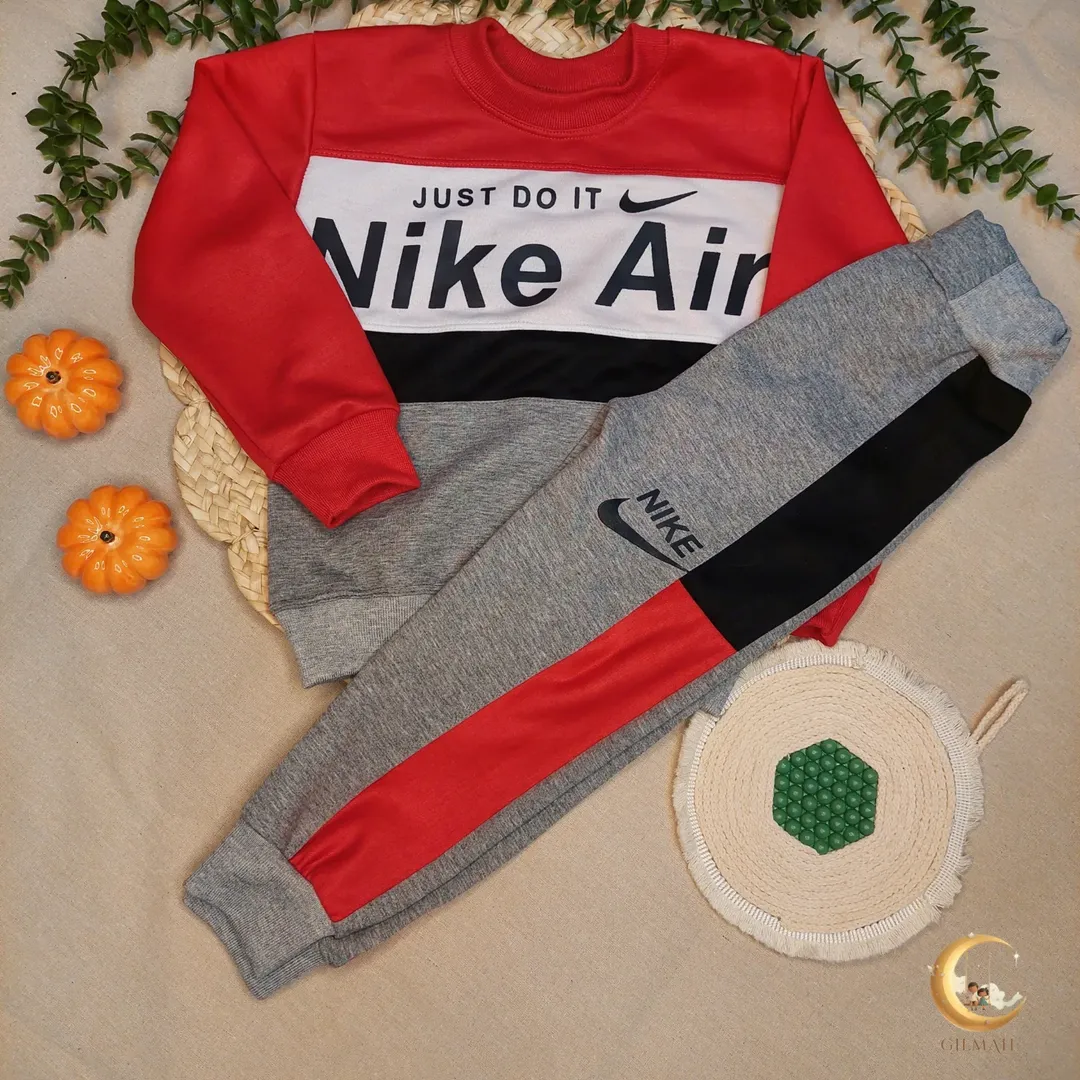 ست بلوز شلوار پسرانه نایک با جنس دورس دونخ و ملانژ دورنگ در رنگهای سبز و قرمز.